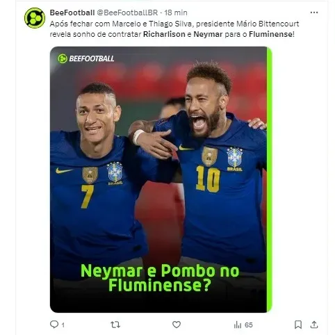 “Se tudo isso conspirar, mais os deuses do futebol, os grandes tricolores que estão conosco de alma, se tudo ajudar, teriam dois jogadores que seriam um sonho. O nosso Pombo, o Richarlison, se ele quiser, as portas estão abertas. E outro que não jogou aqui, mas que admiro como jogador, que é um jogador que todo mundo gostaria de ter, é o Neymar. Se um dia tivermos condições, quem sabe… O Richarlison jogou aqui e sabe a maravilha que a torcida pode fazer. E o Neymar quem sabe voltar a jogar com o Ganso, o Marcelo, o Thiago Silva… Convite feito!”, declarou Bittencourt.
