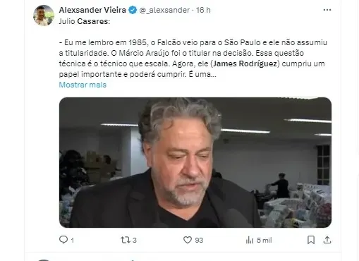 Após a vitória do São Paulo por 3 a 1 sobre o Águia de Marabá, o presidente Julio Casares abordou a ausência de James Rodríguez na equipe, destacando que o jogador tem sido pouco utilizado desde a chegada do técnico Luis Zubeldía.