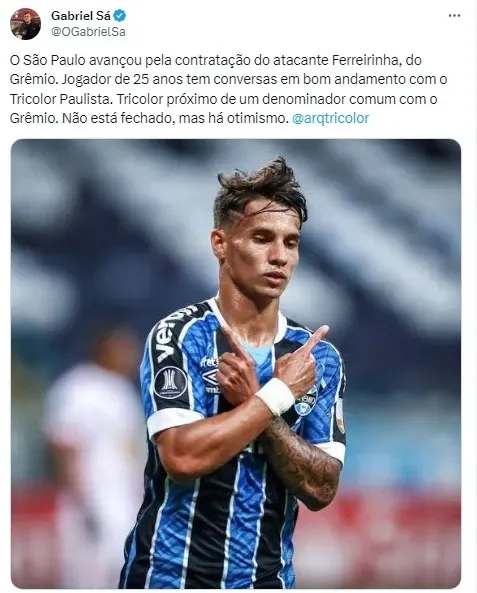 O jogador, que atualmente defende o Grêmio, tem contrato vigente até dezembro de 2024, e, não terá sua renovação realizada. A oportunidade de não renovar o contrato com o Grêmio levou o São Paulo a intensificar as negociações com o staff de Ferreirinha.
