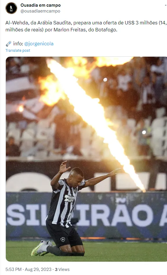 Segundo informações do jornalista Jorge Nicola, o Al-Wehda, da Arábia Saudita, demonstrou interesse em contar com o volante do Botafogo e estaria disposto a apresentar uma proposta de R$ 15 milhões para adquirir o jogador. Ciente da importância de Marlon para a equipe, o Fogão pode dificultar as negociações.