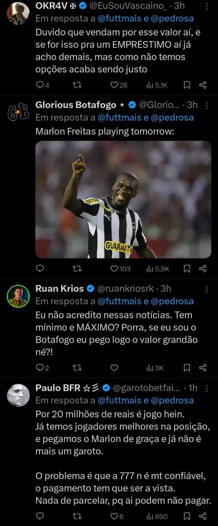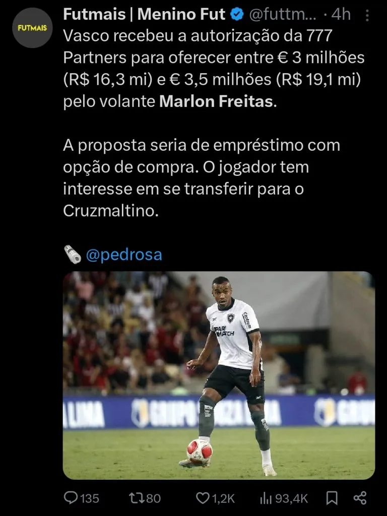 A bola da vez é Marlon Freitas, que há semanas vem sendo especulado no Vasco da Gama. Inicialmente, o Almirante estudava uma proposta de empréstimo.
