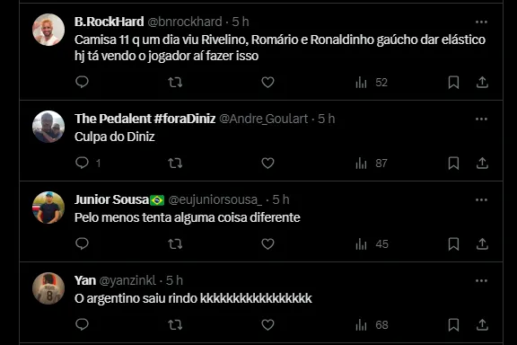 Diniz vem tentando implementar suas ideias, com estreantes e nomes que foram achados na Era Tite. No entanto, o estilo do comandante ainda não é seguido de forma 100% fidedigna.