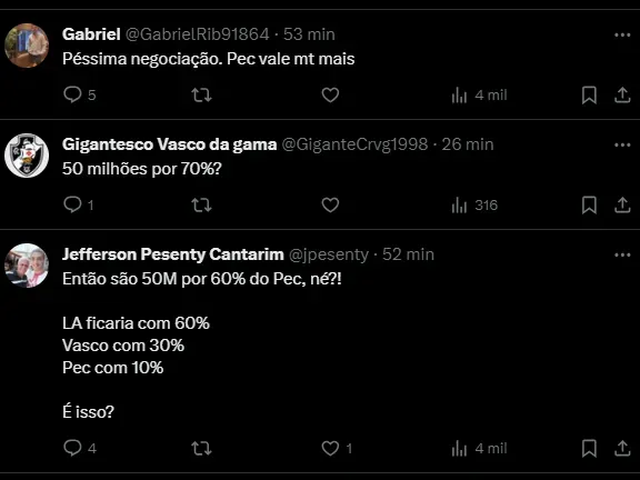“A proposta do LA Galaxy por Gabriel Pec, de quase R$ 50 milhões, não é por 100% dos direitos econômicos do meia. O Vasco manteria 30% dos direitos econômicos do atleta. Clubes estão em conversas avançadas”, informa a dupla.
