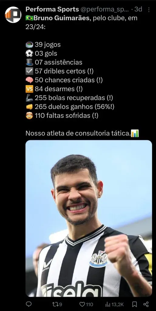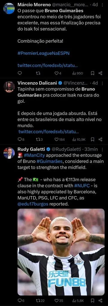 Bruno Guimarães caiu como uma luva no Newcastle e vive ótimo momento na Inglaterra. O meio-campista projetado ao mundo da bola pelo Athletico Paranaense agora interessa a seis times.