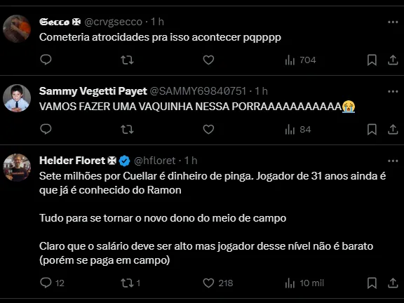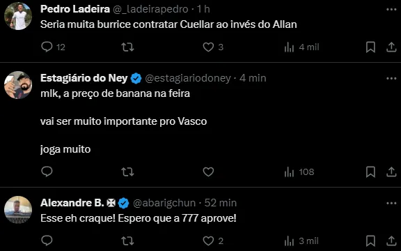 “O Vasco já possui um acordo com Gustavo Cuéllar. O cruzmaltino acenou com pagamento de € 1,3 milhão (R$ 7 milhões) pelo volante e recebeu uma resposta positiva do Al-Shabab”, informa Guilherme Abrahão, da Itatiaia.