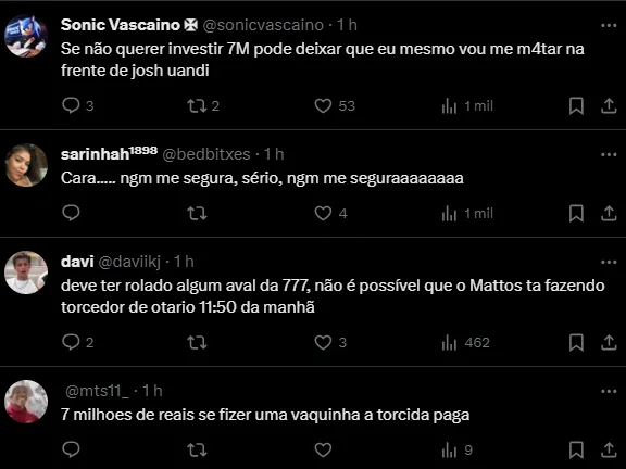 “O Cruz-Maltino aguarda apenas o aval da 777 Partners para fechar a contratação. Alexandre Mattos mantém contato diário com os representantes do volante e também trabalha no convencimento dos americanos”, acrescentou.