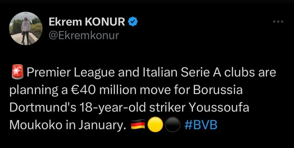 Segundo informações do jornalista Ekrem Konur, o Borussia Dortmund deve receber em breve ofertas da Premier League e também da Serie A por Youssoufa Moukoko. Os clubes não foram revelados pelo jornalista.