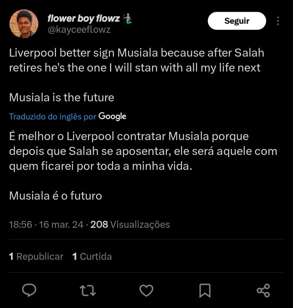 Além do time de Mohamed Salah e companhia, outras equipes da Premier League também desejam o atleta. É especulado pela mídia britânica que o Manchester City surge como forte concorrente a assinar com Musiala.