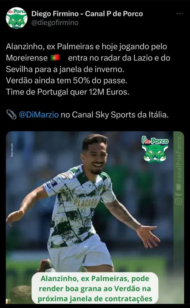 Segundo informações do jornalista Gianluca Di Marzio, o meia Alanzinho, ex-Palmeiras e atualmente no Moreirense, entrou no radar da Lazio e também do Sevilla.