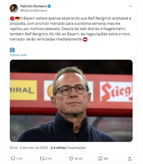 O jornalista italiano Fabrizio Romano relatou que Ralf Rangnick, atual treinador da Seleção Austríaca e principal candidato para assumir o comando do Bayern de Munique, recusou a proposta para dirigir os Bávaros.