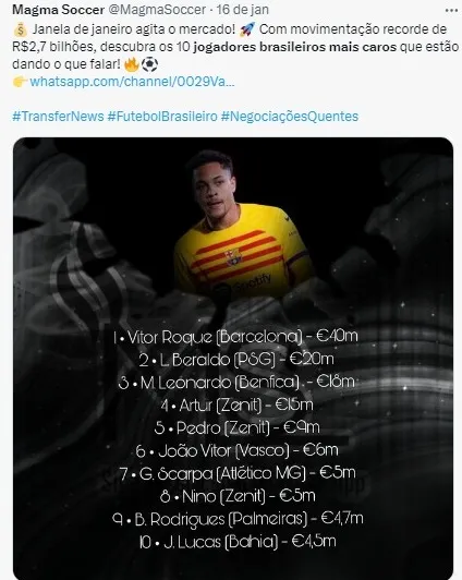 O destaque dessa janela foi Vitor Roque, protagonizando a maior transação global de 2024 ao trocar o Athletico-PR pelo Barcelona por 40 milhões de euros. No entanto, Roque encontra-se na 31ª posição do histórico, longe do top 10.