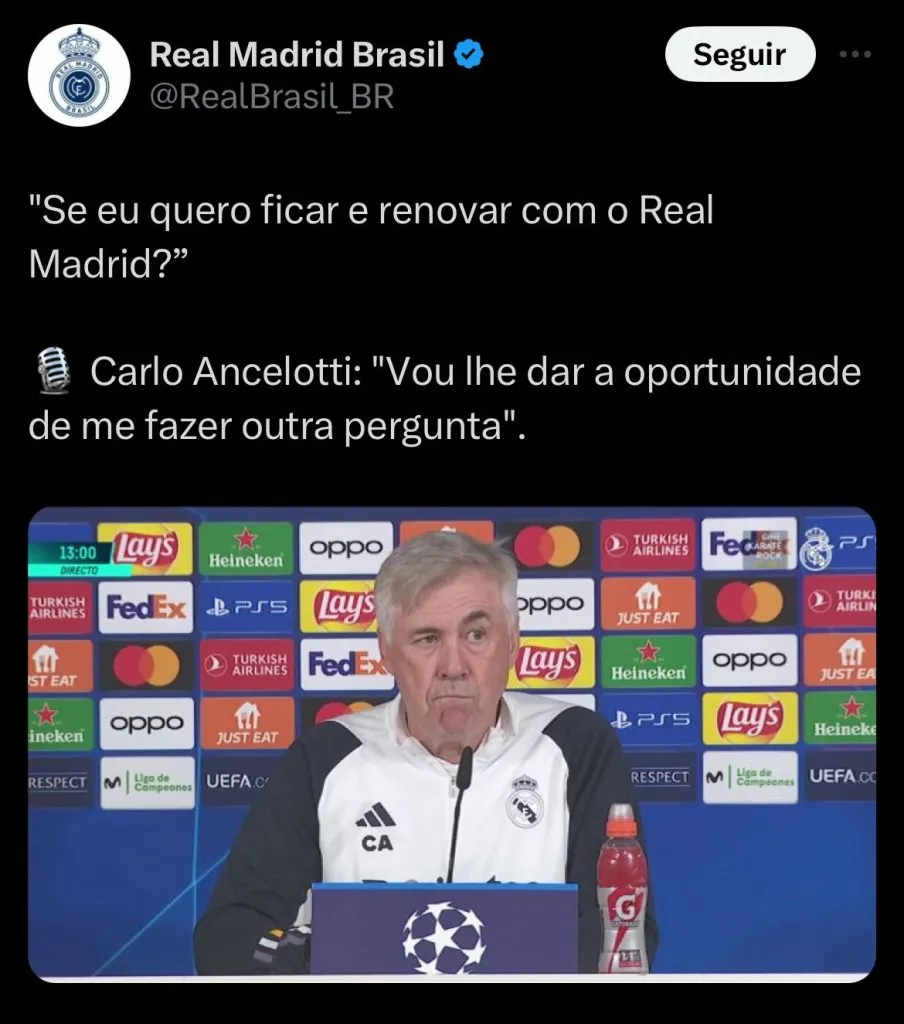 Vale lembrar que o Real Madrid teria supostas conversas ativas com Roberto De Zerbi, do Brighton, para assumir o comando, caso Ancelotti não renove o contrato.
