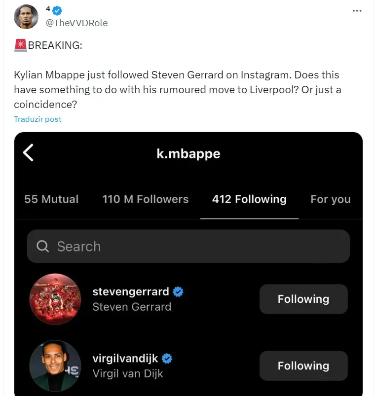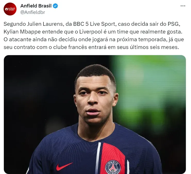 A fonte não entra em maiores informações, apenas frisa que o Liverpool é um time que Mbappé gosta muito. De fato, segundo relatos da Inglaterra, os Reds estão de olho no francês, mas, por ora, não há nenhuma negociação.