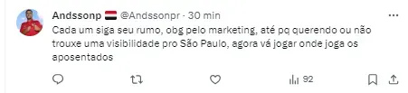 Ele estreou contra o Flamengo, no Rio e havia a expectativa que ele fosse escalado na partida em casa. Chegou a reservar lugares em um restaurante de São Paulo para celebrar a classificação. Frustrado por não entrar no jogo, cancelou o encontro, segundo o Ge. E a partir de então, entra o atrito com o ex-treinador da equipe, Dorival Júnior.