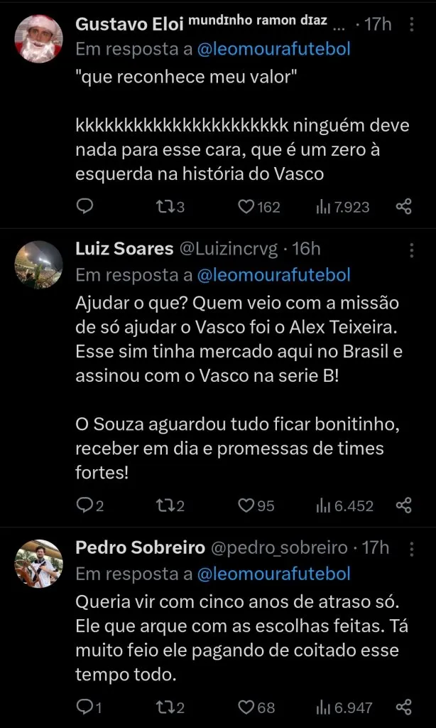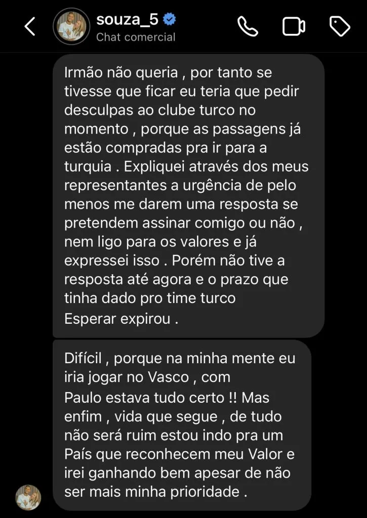 “Nem ligo para os valores e já expressei isso. Porém, não tive resposta até agora e o prazo que tinha dado me esperar acabou”, acrescentou Souza em papo com o comentarista conhecido no Twitter como Leo Made In Colina.