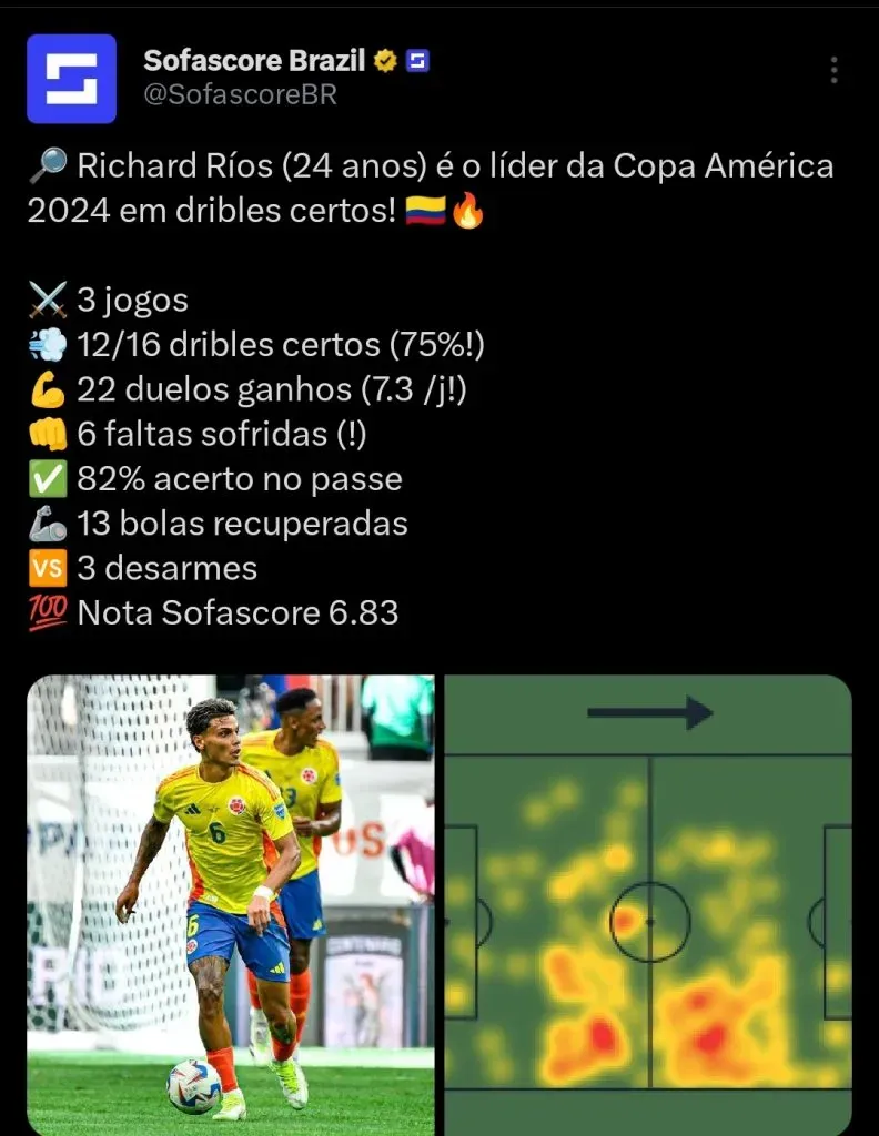 O meio-campista Richard Rios tem sido um dos grandes destaques da Colômbia na disputa da Copa América 2024. Ele pertence ao Palmeiras, e já tem sido observado por grandes potências do futebol europeu.