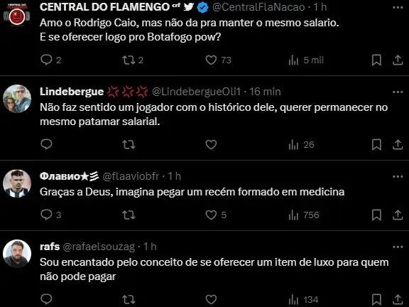 “O zagueiro Rodrigo Caio, ex-Flamengo, foi oferecido ao Botafogo. A situação não avançou. Um dos motivos é o salário altíssimo do jogador, que não aceita reduzir os valores no momento”, informa o setorista do Fogão.