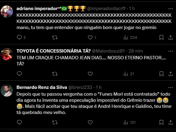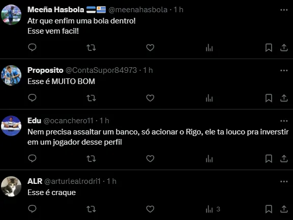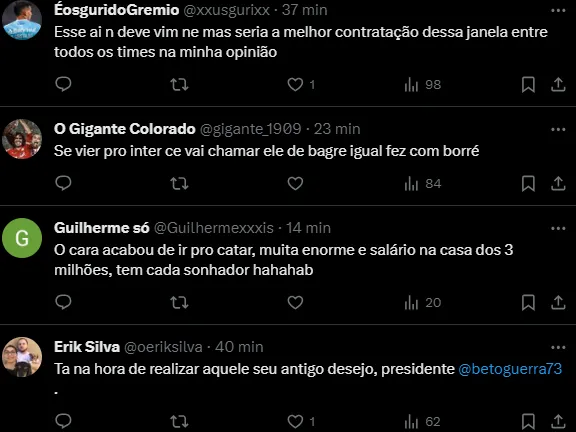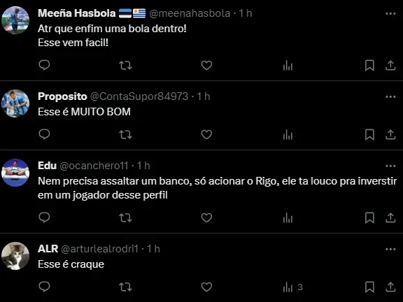 Torcedores do Grêmio notificam ao empresário Celso Rigo sobre a possibilidade do Imortal buscar informações sobre R. Guedes e enfim trazê-lo para defender o Tricolor em 2024.
