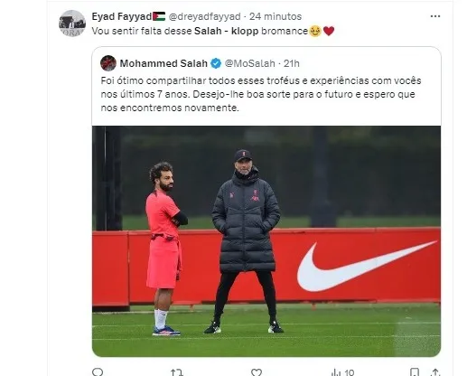 “Foi ótimo compartilhar todos esses troféus e experiências com você nos últimos sete anos. Desejo boa sorte para o futuro e espero que nos encontremos novamente”, disse Salah, acompanhando a mensagem com uma foto ao lado de Klopp.