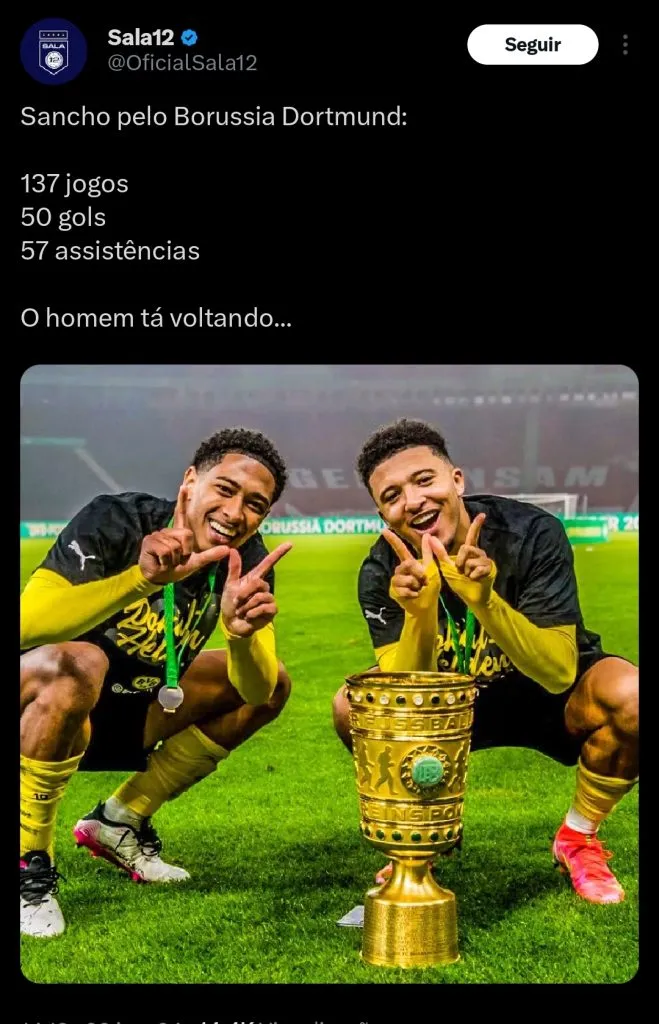 As equipes estão a poucos detalhes de confirmar a transferência do atacante, o que deve se concretizar em breve. Sancho deu sinal verde para que os alemães possam avançar nas negociações com o United.