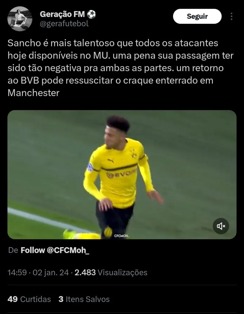 Convivendo com problemas com o treinador Erik Ten Hag, o atacante inglês Jadon Sancho parece não ver um futuro com as cores do Manchester United. Nesta temporada, ele ainda não atuou, e nem sequer vem sendo relacionado pela comissão técnica.