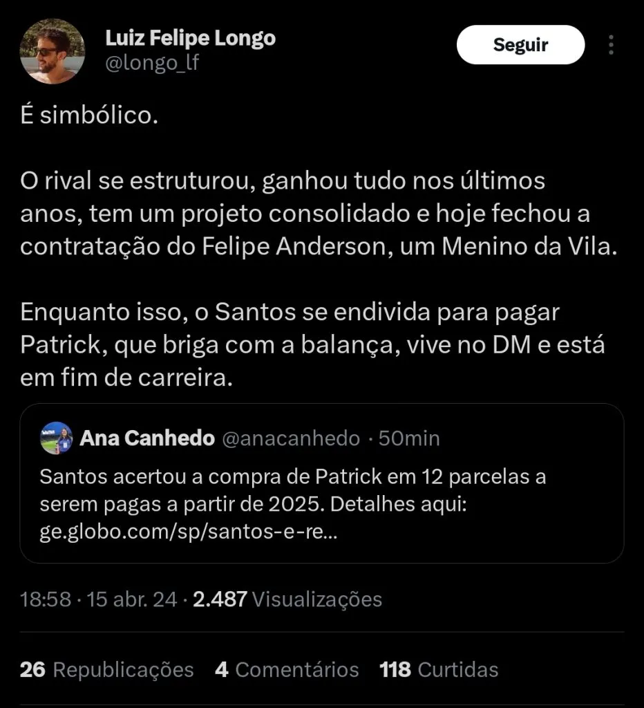 Para concluir a chegada de Patrick, o Peixe precisará pagar uma quantia considerável em dinheiro. Ele chega como um dos principais reforços do time para a Série B, e a princípio chega para brigar por posição.