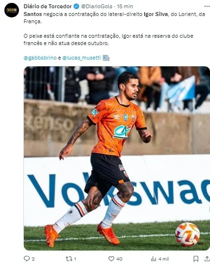 O Santos está ativamente envolvido em negociações para reforçar sua equipe, e o alvo atual é o lateral-direito Igor Silva, que atualmente joga pelo Lorient, da França.
