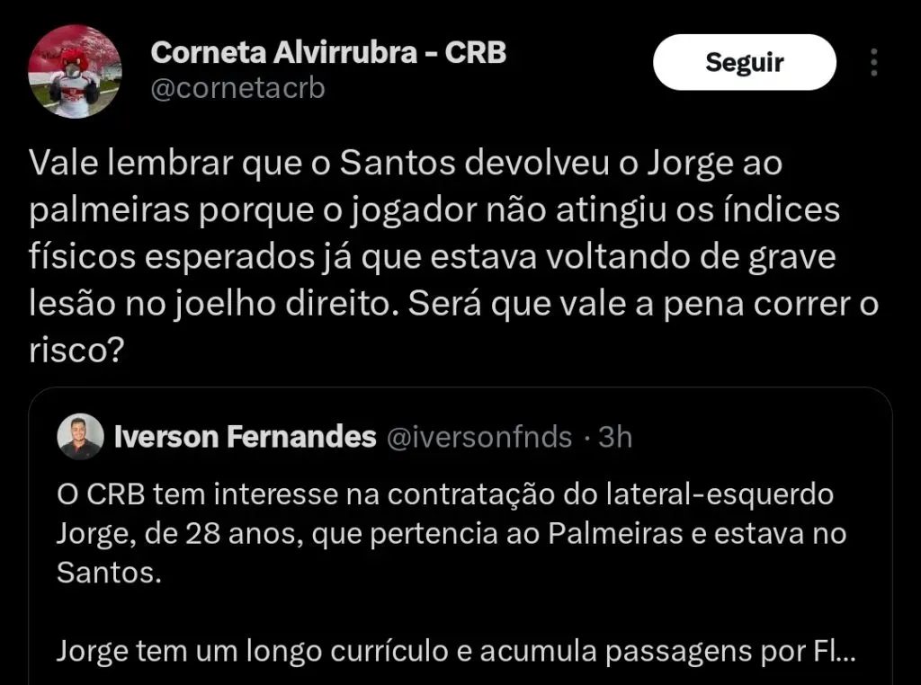 O jornalista Emerson Junior informa que o CRB tem grande interesse na contratação de Jorge para a sequência da temporada.