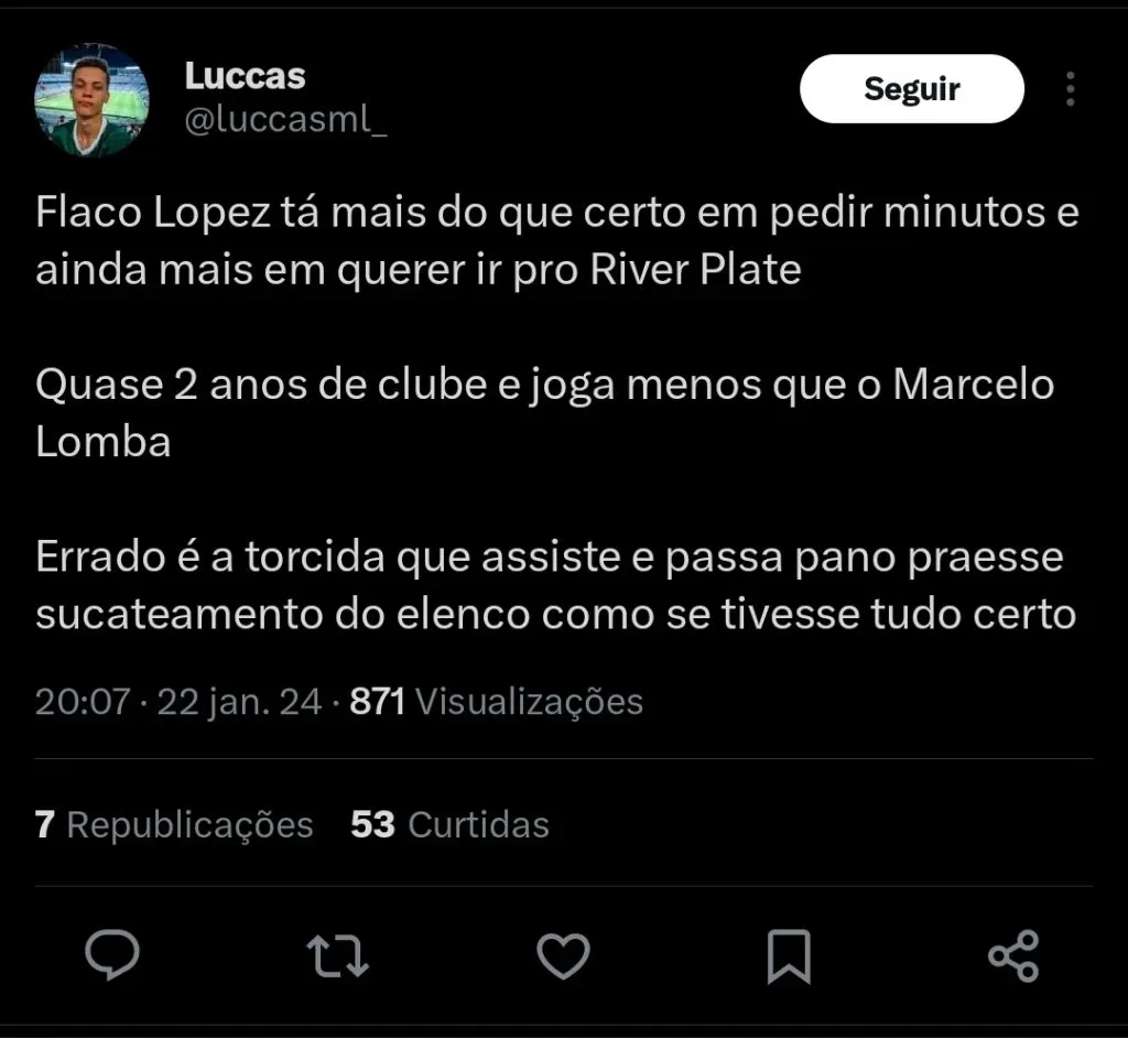 O jornalista Cesar Luis Merlo informa que o River Plate realizou uma nova oferta pela contratação de Flaco Lopez.