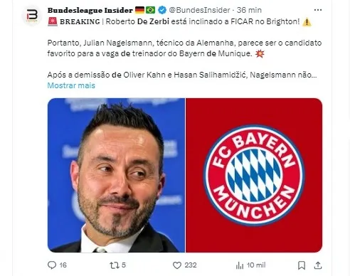 As conversas sobre o futuro de De Zerbi devem se intensificar nas próximas semanas, mas as chances de ele permanecer à frente do Brighton para a próxima temporada são consideradas altas, o que traria estabilidade e continuidade ao projeto do clube inglês.