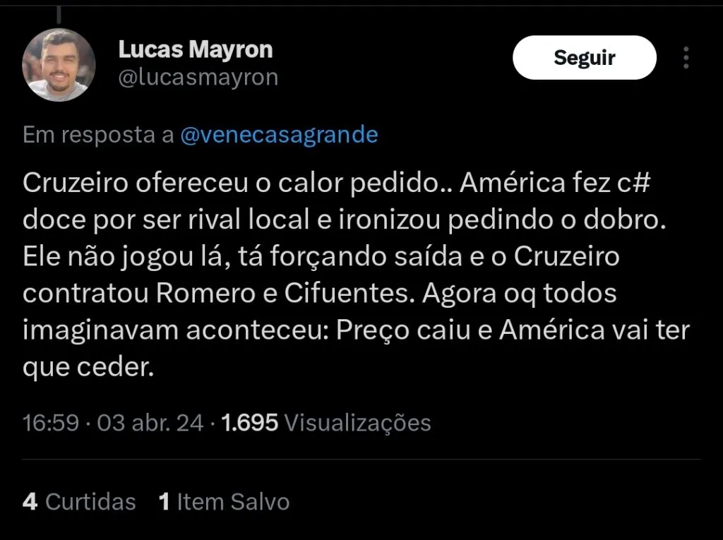 No momento, o América MG e o volante priorizam uma venda em definitivo. A equipe pede cerca de U$2 Milhões por Emmanuel, e não deve dificultar caso o Fortaleza ofereça algo próximo disso.