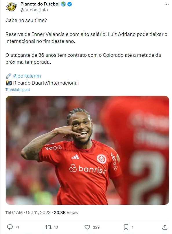 Além disso, a titularidade de Enner Valencia e seu desempenho sólido neste início de passagem pelo clube brasileiro também pode ser um fator crucial para a saída de Luiz Adriano, que não desfruta do mesmo espaço que tinha anteriormente.