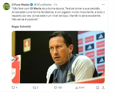 “Quando ele veio no verão, foi algo grande para nós, para os torcedores e para o futebol. É uma história fantástica começar na Europa como argentino no Benfica e, depois de uma grande carreira, voltar para o clube e continuar jogando em alto nível. No entanto, a situação atual é delicada, especialmente considerando as circunstâncias pessoais de Di María”, explicou Schmidt.