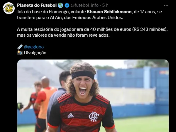 Tite não quer mais um volante da base eKhauan Schlickmann é vendido pelo Flamengo. Em um contrato de quatro anos, o jovem de 18 anos assina com o Al Ain, treinado por Hernan Crespo.