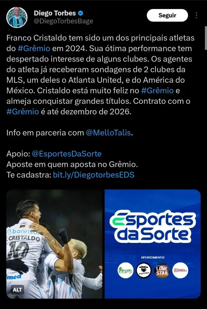 O jornalista Fabio Vargas informa que o Atlanta United demonstrou interesse na contratação do meio-campista Franco Cristaldo.