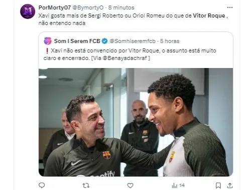 Sobre as críticas públicas feitas pelo empresário de Vitor Roque, André Cury, Xavi respondeu que no Barcelona há uma competição acirrada por vagas no time titular. Ele enfatizou que as decisões sobre a escalação são tomadas com base no desempenho e nas condições dos jogadores, e que Vitor Roque, por ser jovem, está competindo com atletas experientes.