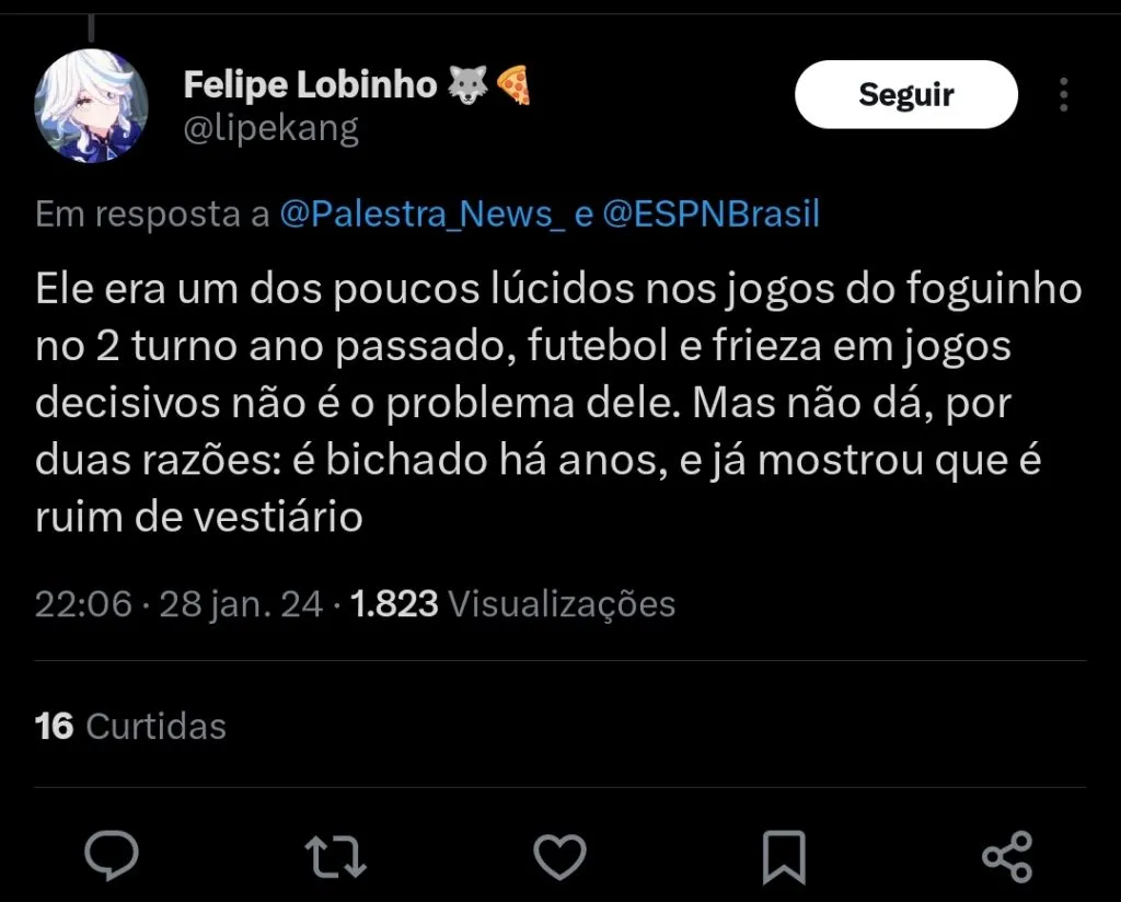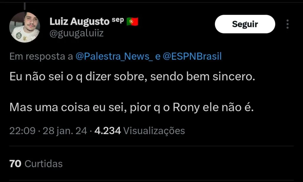 Ainda segundo a fonte, Diego é palmeirense e não dificultaria as negociações com o alviverde paulista. No momento, nenhuma proposta foi feita por parte da diretoria do clube paulista.