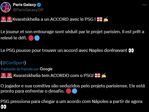Kvaratskhelia já teria um acordo direto com o PSG. Resta agora os clubes se acertarem em relação aos valores, haja vista as conversas avançadas com o jogador e o staff do camisa 77.