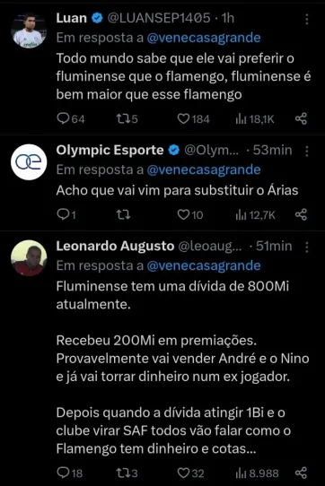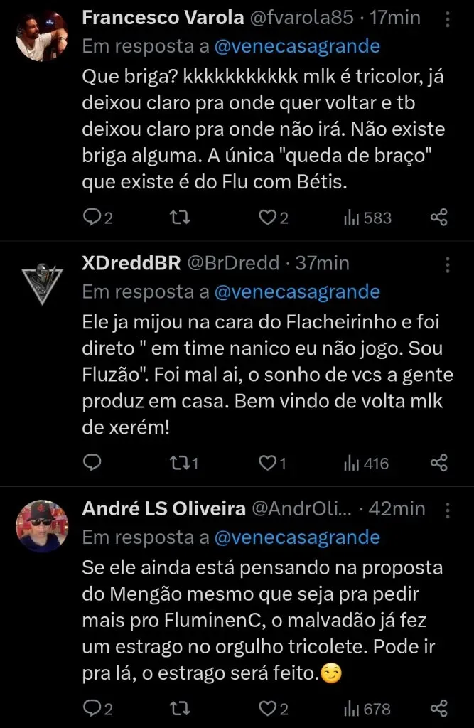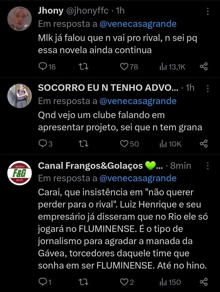 “O Tricolor, além de ver em Luiz Henrique um grande reforço, não quer perder o atleta para o rival. O Flamengo continua tentando também e não desistiu. Fla x Flu nos bastidores do mercado da bola”, acrescentou.