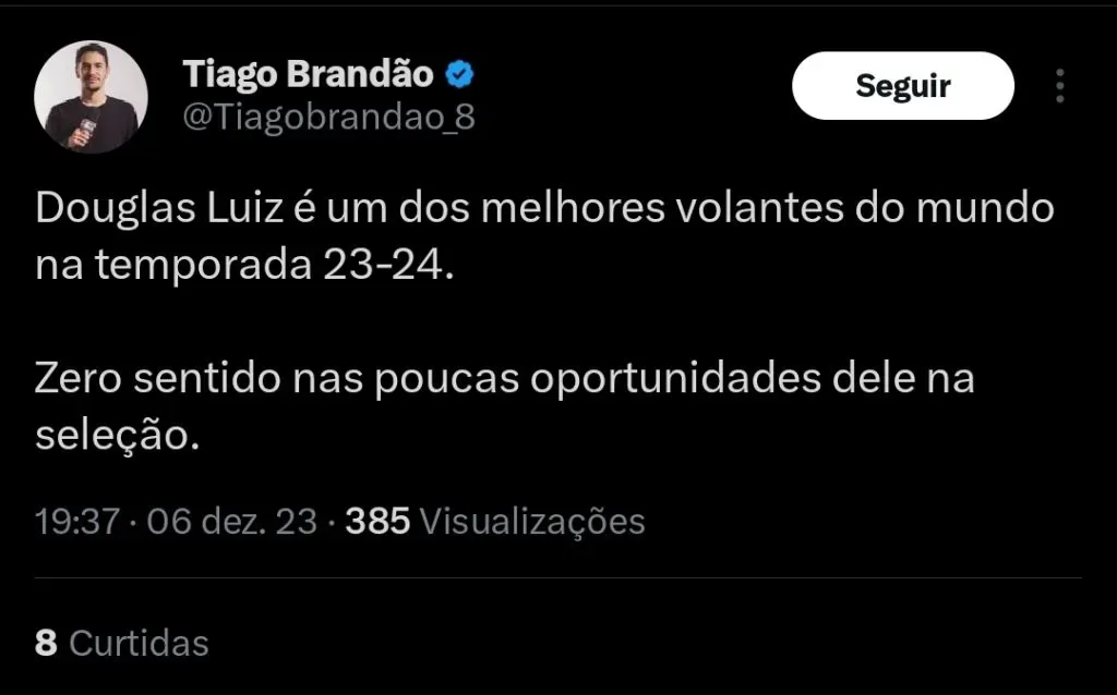 De acordo com informações divulgadas pelo portal Football Transfers, o Aston Villa só aceitará vender Douglas Luiz pelo valor de £110 milhões, aproximadamente R$680 milhões.