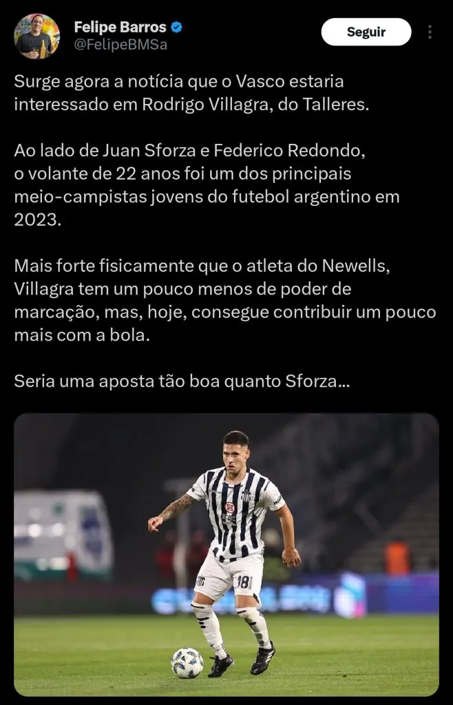 O jovem volante argentino vem sendo um dos destaques do Talleres, e também da Seleção Argentina sub 23. Várias equipes tem monitorado o meia, incluindo o Vasco.