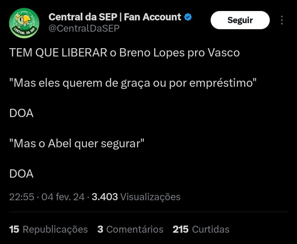 No momento, não existe nenhuma oferta oficial pela contratação do ponta. Abel gosta muito do jogador e pode dificultar bastante a vida do Vasco nas tratativas pela chegada do atacante.
