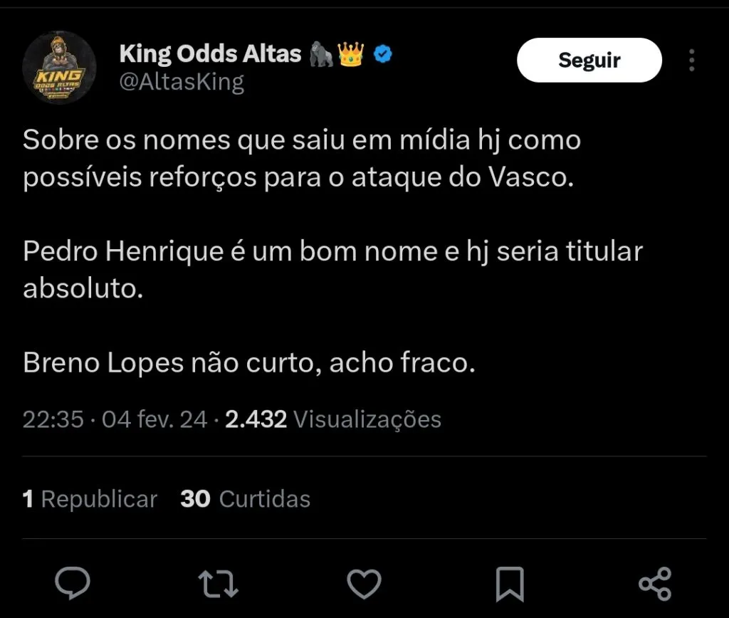 O setorista Matheus Giuberti reporta que o Vasco tem grande interesse na contratação do atacante Breno Lopes, do Palmeiras.