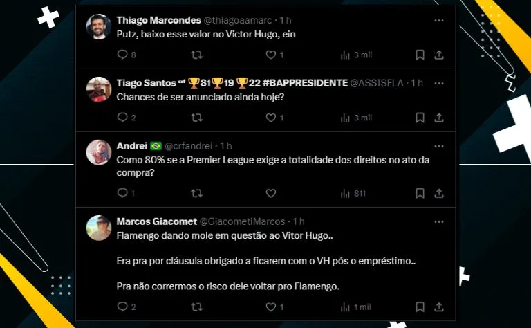 “Ano passado o Wolverhampton ofereceu 20 milhões de euros no Vitor Hugo e esses canalhas não venderam. Agora vai sair desvalorizado e sem nada”, criticou um flamenguista.