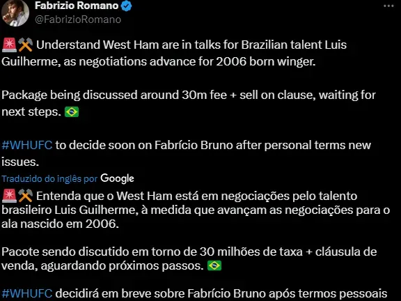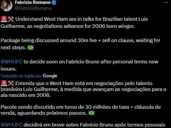 Mesmo assim, o West Ham enviou ao Brasil olheiro para acompanhar de perto o jovem Luís Guilherme. O mesmo diretor que tentou levar Fabrício Bruno à Inglaterra é o que negocia a compra do prodígio palmeirense.