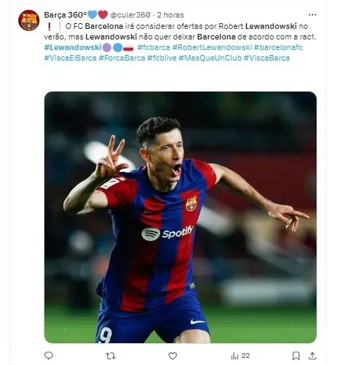 Desde sua chegada em 2022, Lewandowski tem contrato com o Barcelona até junho de 2026. Em duas temporadas, o atacante acumula 90 jogos, 56 gols e 16 assistências, até o momento.