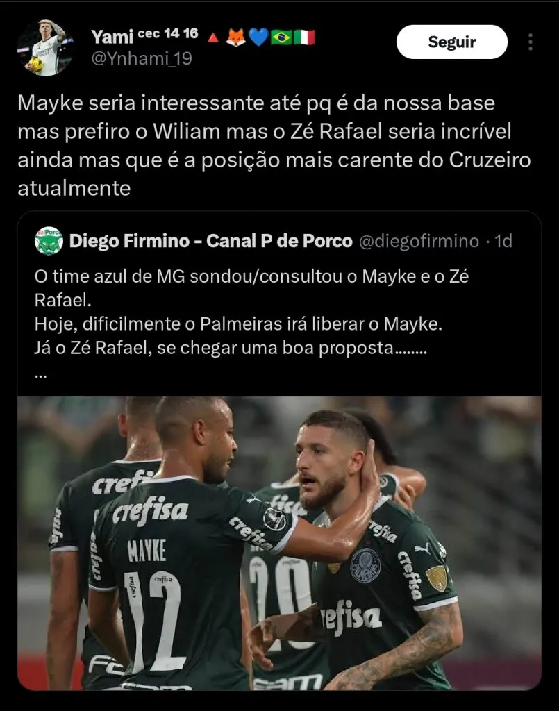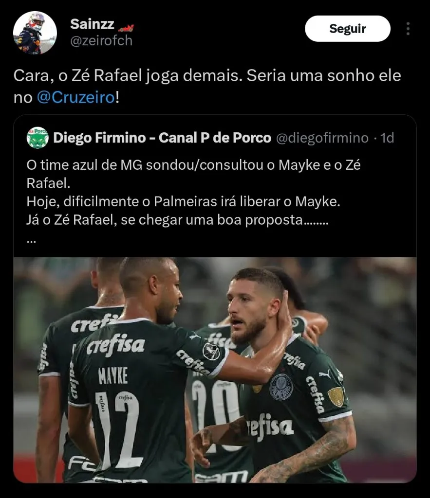 Você acha que o Palmeiras pode negociar Zé Rafael com um rival brasileiro?